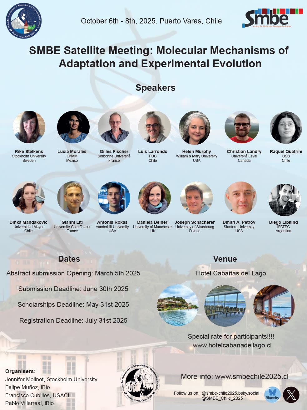 Dates are now confirmed for the 2025 SMBE Satellite Meeting in Chile: Molecular Mechanisms of Adaptation and Experimental Evolution. Join us in Puerto Varas for the latest advances in evolutionary biology.